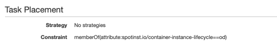 Ocean provides a custom placement restraint which enables you to control how specific tasks are scheduled. For example, if you have mission critical tasks that cannot run on spot instances, you can use the placement restraint spotinst.io/container-instance-lifecycle to schedule tasks only on on-demand instances. The format of the placement restraint is shown below:
